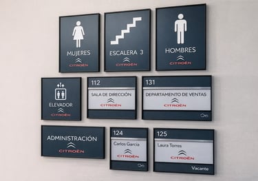 Señalética semi rígida fabricada en acrílico o PVC, para interiores y exteriores. Permite impresiones nítidas, cortes precisos y múltiples sistemas de fijación, logrando piezas durables, livianas y con excelente presencia visual para identificar espacios, marcas o mensajes institucionales.
