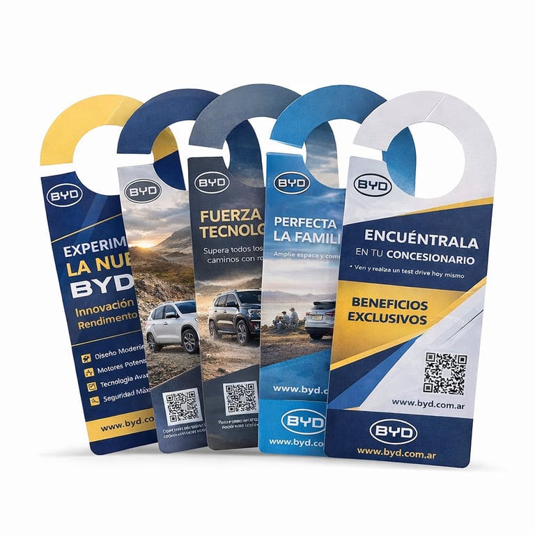 Piezas gráficas colgantes diseñadas para colocar en retrovisores, puertas, etc. Ideales para comunicar promociones, mensajes de marca o información puntual en espacios comerciales y eventos. Son livianas, visibles y permiten una comunicación directa en el punto de contacto.