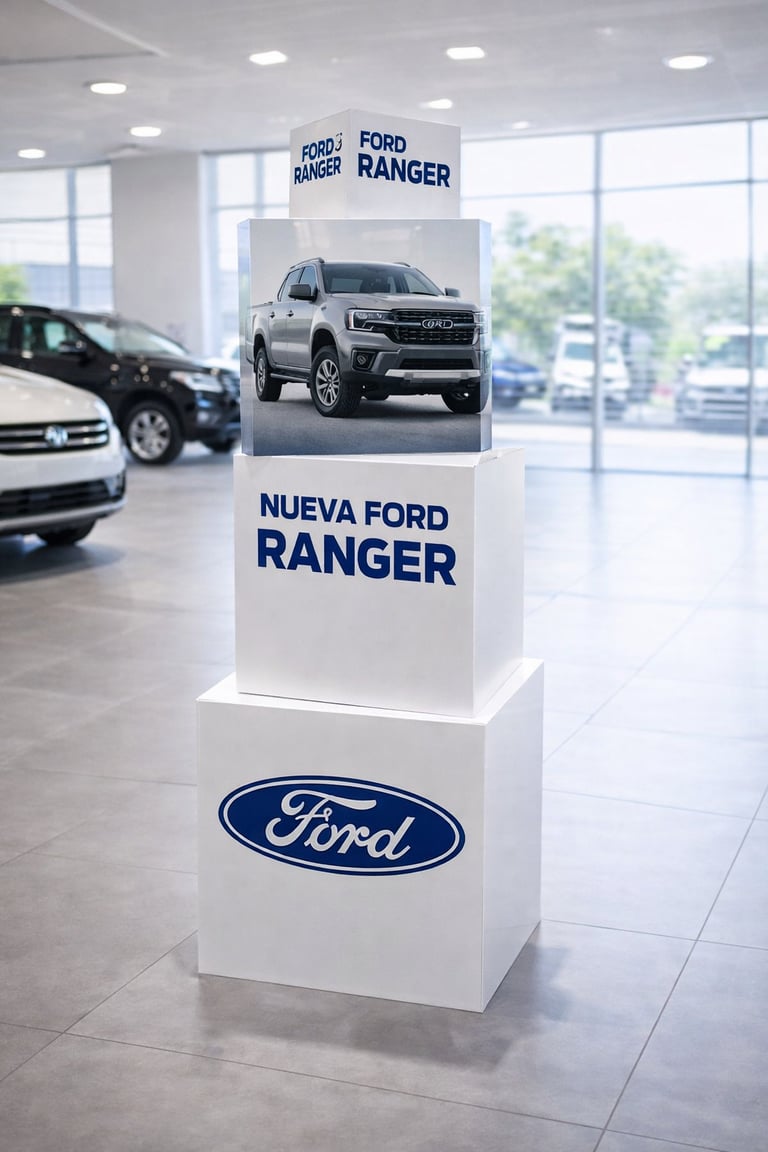 Estructuras tridimensionales impresas para exhibición en concesionarios, vidrieras o eventos. Permiten comunicar atributos del producto desde múltiples caras, generando alto impacto visual y reforzando la presencia de marca. Son livianos, modulares y fáciles de montar para campañas promocionales.